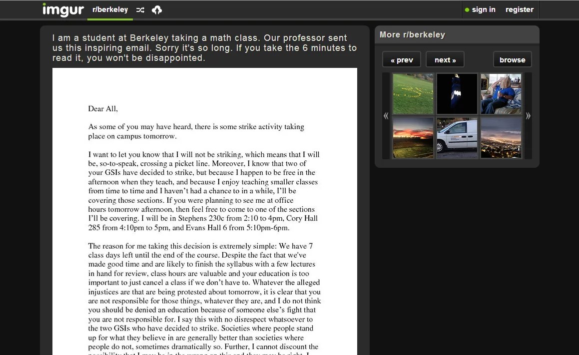One of the more enlightening reads I’ve come across on Facebook (and the Internet in general) was written recently by a Berkeley professor in an email to his students and posted to Reddit. Reading this, I felt like this teacher was sharing a lifetime’s worth of experiences, in a way that didn’t feel belittling or trite. I sensed a genuine concern for the well-being of his students, and a trust that this new generation was just as capable as past generations to make a marked difference in the world.
