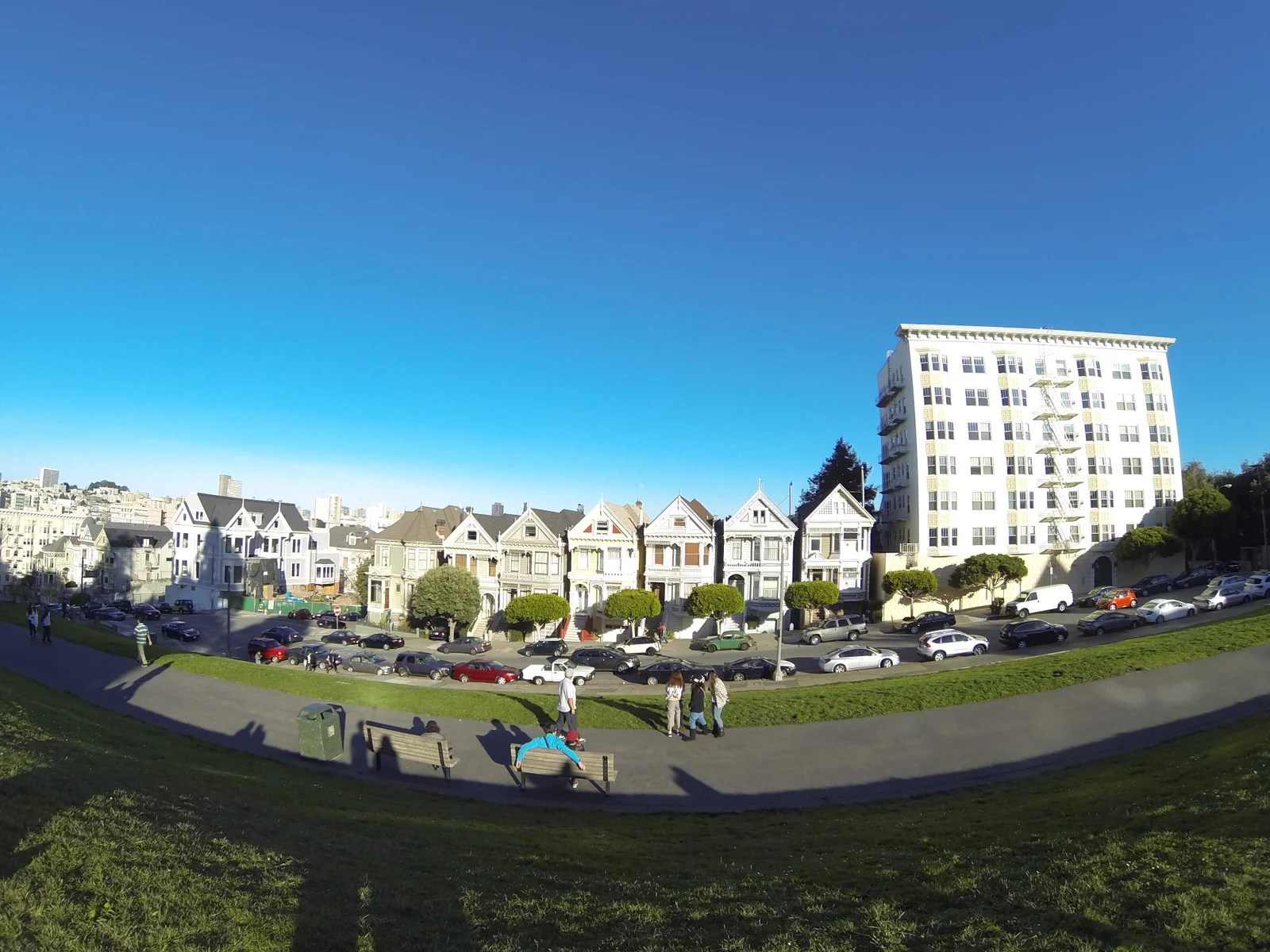 Thankfully, there weren’t any double-decker tour buses there to spoil an otherwise perfect view. Alamo Square Park itself was very nice, almost like the bigger sister of the rowdy and fun Dolores Park in the Mission. There was a mix of people, from tourists to locals, sitting and standing around the grass, chatting, taking pictures, drinking wine, playing with their dogs, and otherwise just enjoying a nice day out.