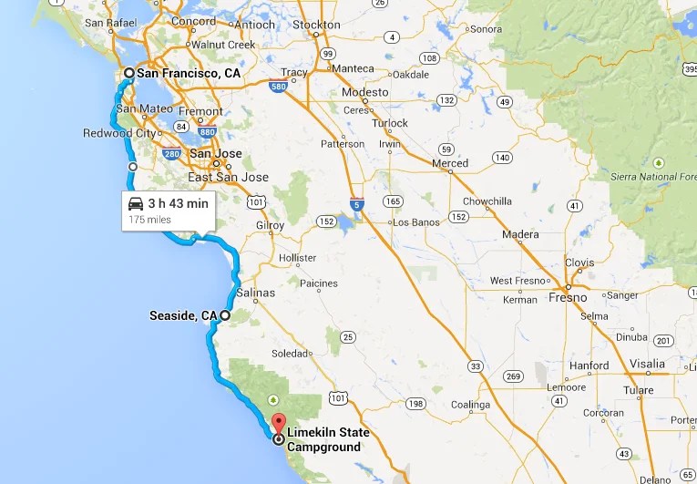 The second part of my journey was the part I was really looking forward to. I’d read so many positive things about the stretch of highway for this route. Soon I knew these accounts were true – I was in motorcycle-riding heaven! Even though there were more cars now and the roads were mainly one or two-lane twisties, I had so much fun just following the flow of the road. It reminded me of my favorite riding roads at Grizzly Peak in Berkeley from my college days, but even more enjoyable with its sweeping turns disappearing into beautiful cliff-side ocean scenery. The forested parts of this route were equally nice, and though the ride was about 1.5 hours, it felt like only 20-30 minutes had gone by as I pulled into the campsite at Limekiln State Park.