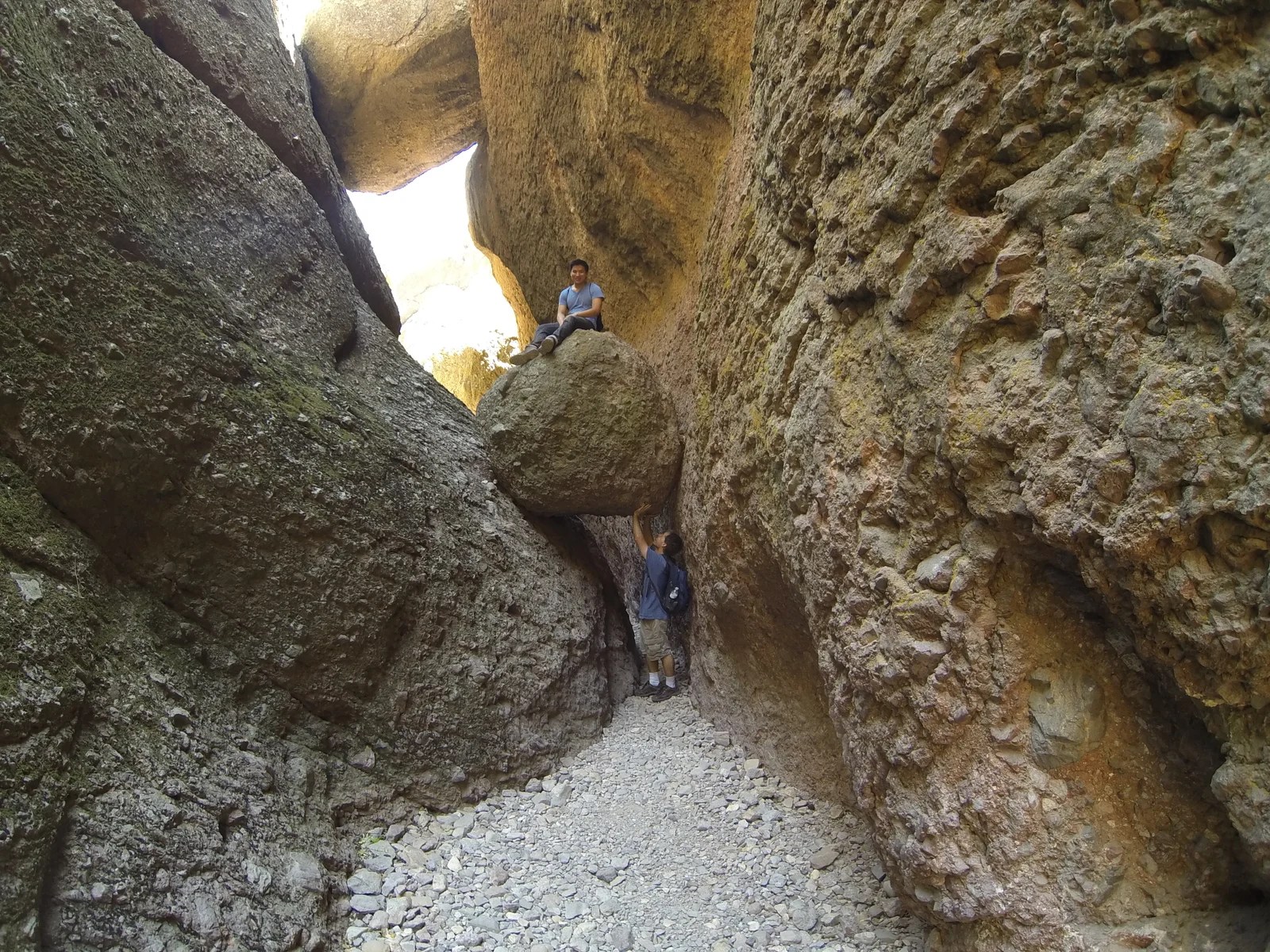 The immediate sensation upon entering the cave was pitch darkness. I turned my flashlight on. As we navigated through the cave, we had to duck at certain points and watch our steps on the rocks. We saw water dripping from some of the rocks and eventually had to climb a bit to exit the cave and continue along the trail. There weren’t any bats in this cave, but we did pause near the exit to snap some photos of a giant circular rock that was wedged between the passageway, hanging perilously over our heads. Jay got a kick out of that one as we took pictures with him holding up the rock and me standing on top of it.