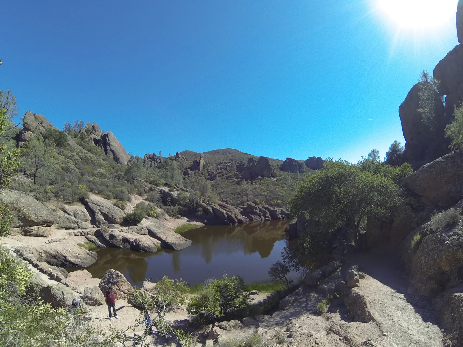 As we were deciding on our next steps in the visitor center, we overheard the guide telling a visitor that it was over 100 degrees that day. We were definitely pretty winded from our earlier hike, but overall we felt pretty good still and decided to challenge ourselves with some more hiking. After all, the day was still young. We ended up selecting the trail leading to Bear Gulch Cave, which was unfortunately closed for nesting bats, but we would still be able to see Bear Gulch Reservoir.