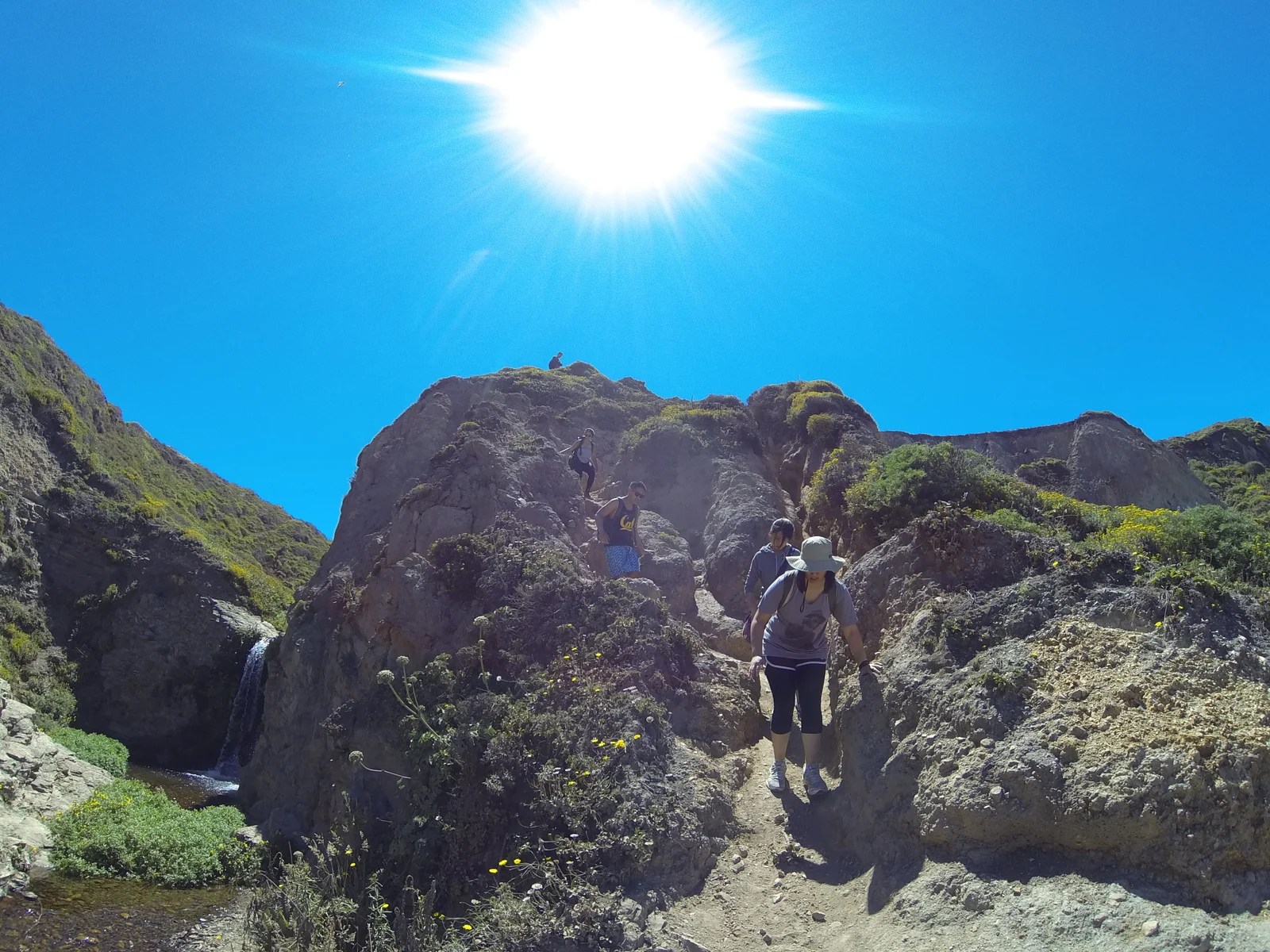 Our trip started at the Palomarin Trailhead, where we parked and hit the well-known Coast Trail that would lead us to the waterfall. The initial portion of the hike was nice and forested, with plenty of trees providing some nice shade from the sun, interspersed with patches of sun-lit vegetation. I hadn’t seen a lot of my friends in a while, so we used the time out in nature to catch up on life and enjoy the nice scenery. Soon we hit a fork in the road and the Coast Trail abruptly narrowed, becoming almost tunnel-like. We had to gingerly make our way through, taking extra care to avoid the poison oak growing in the area. But we made it out okay and found ourselves getting closer to the beach, where we would finally see the waterfall.