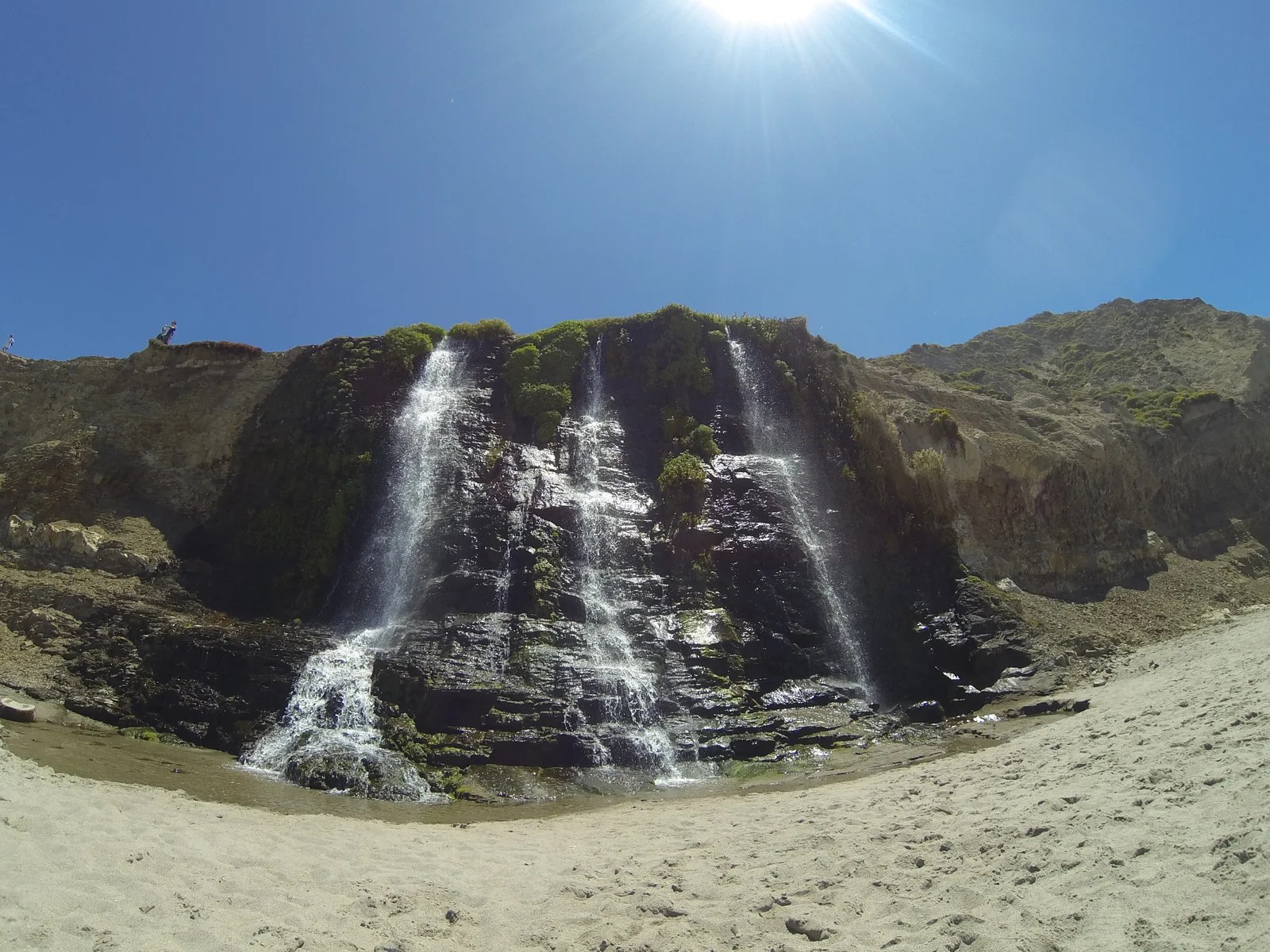 After lunch, we climbed down some more rock formations to get to the beach and see the actual waterfall. As I stepped into the sand and Alamere Falls came into view, I immediately noticed the stark contrast of seeing a freshwater waterfall emptying into the sand on a beach and flowing into the ocean directly across. There was a bit of cognitive dissonance going on here, but at the same time I thought it was a really cool setup. This was the first time I’d witnessed a “tidefall” – a waterfall that flows directly into the ocean.