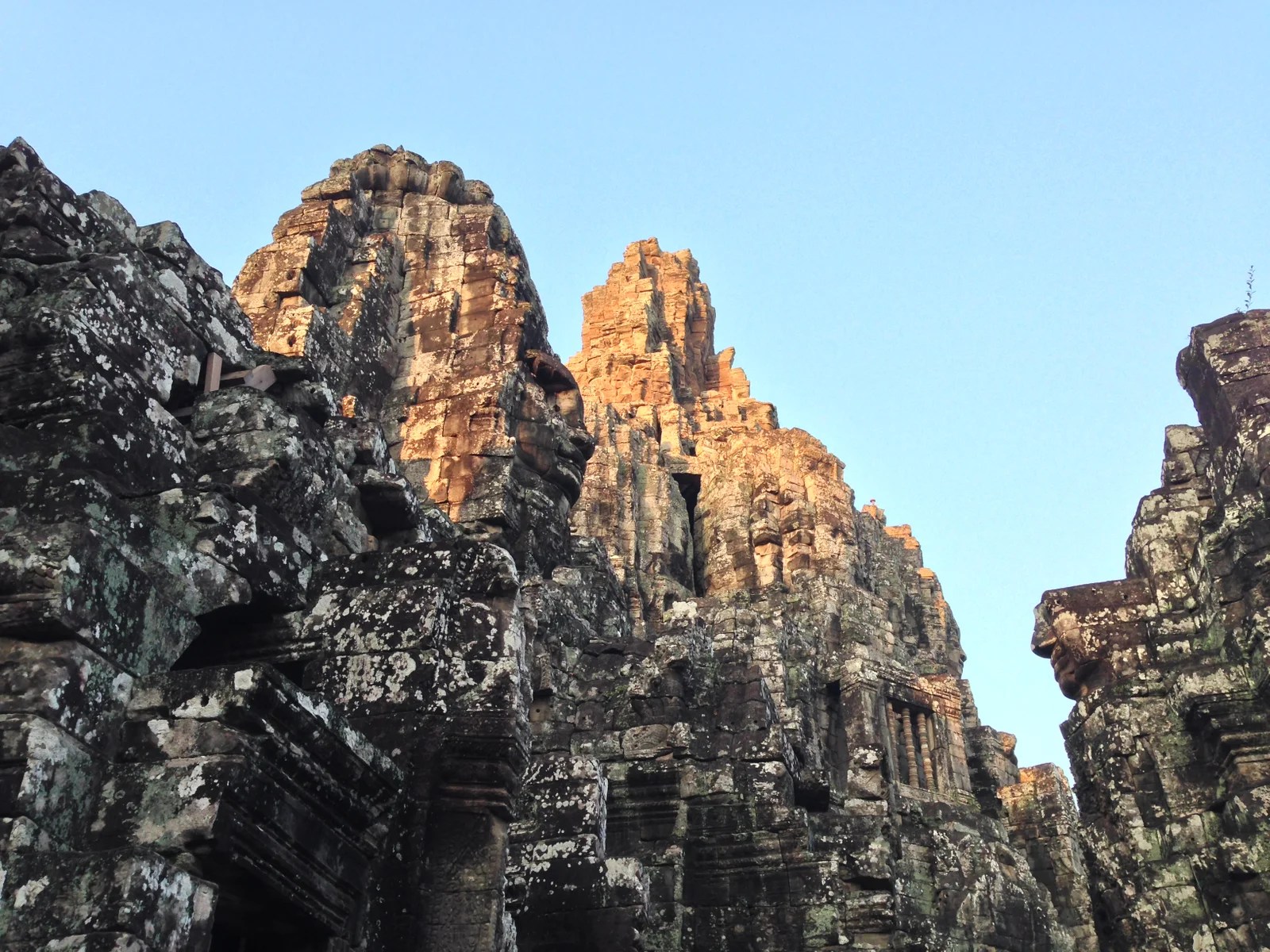 Finally the sunlight came and lit up what seemed to be a new world surrounding us. The limestone rocks of the structures changed color as the golden light reflected off of carved faces. Our guide reappeared and launched into a half-hour introduction of the history of the city and temple ruins we were standing on. Angkor Thom was built in the 12th century on top of previous cities, and served as the final capital of the Khmer empire. It was fascinating seeing all the intricate carvings and imagining what the city must have been like in all its splendor.