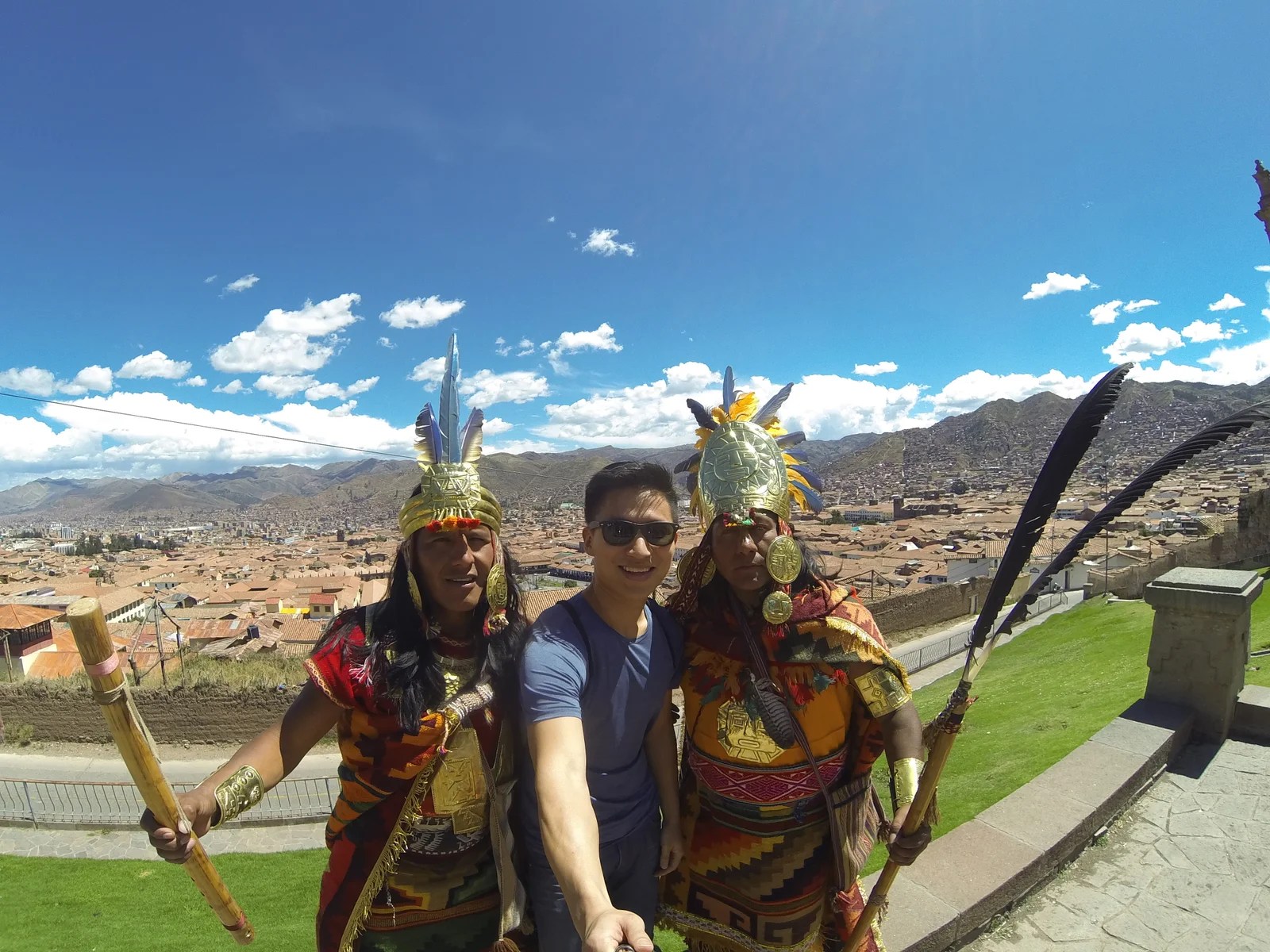 Continuing our tour, we walked up quite a few flights of steps through the alleyways leading to one of the best viewing points for the city. The sight was incredible – rows and rows of red rooftops contrasted with the blue sky and brown mountain ranges. We spent a good amount of time enjoying the view and even caught a musical performance from some locals dressed as Inca royalty.