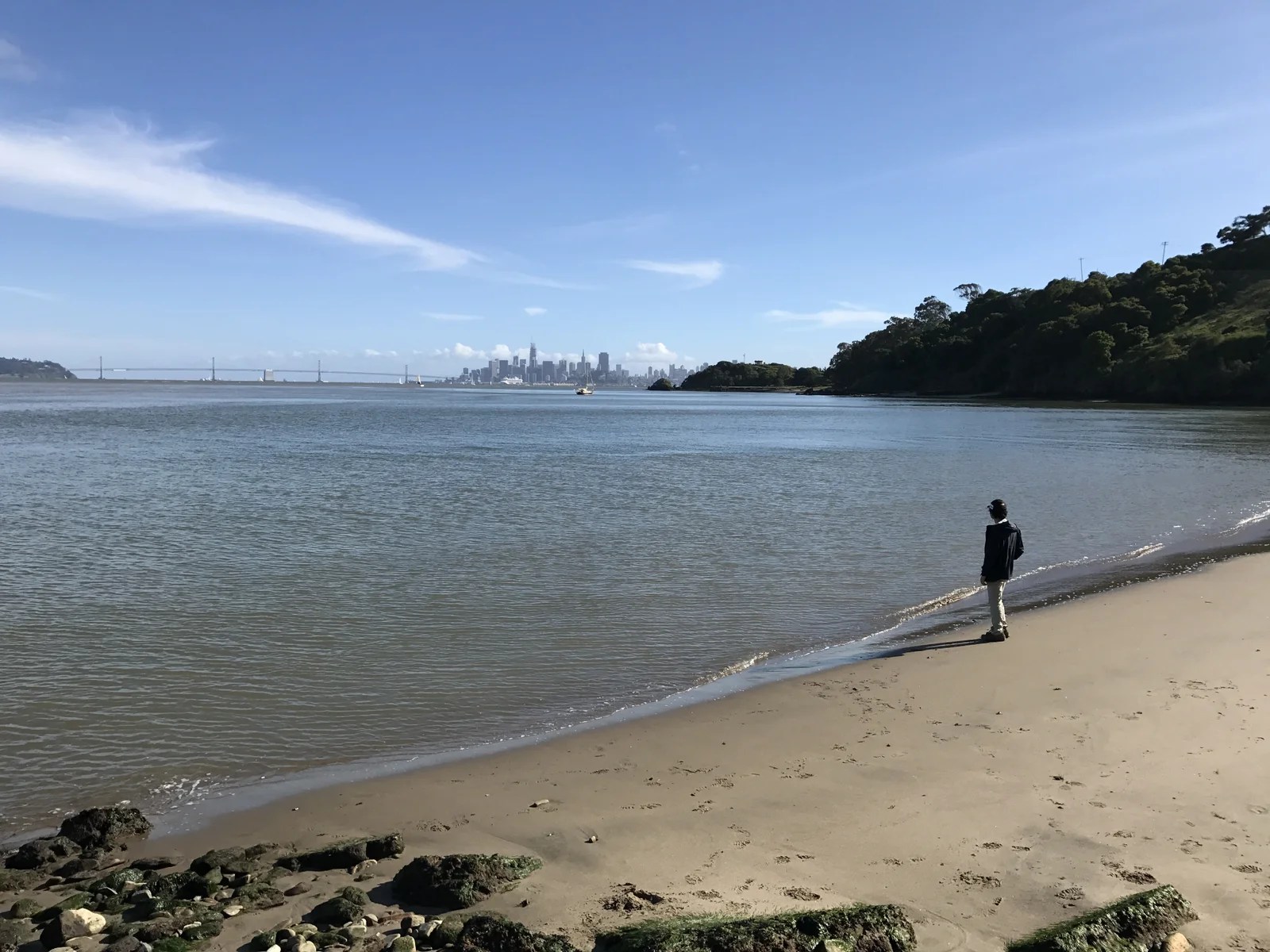 We spotted the path to Quarry Beach right outside the fort area and walked over. The beach wasn’t very big, but as we sat on top of a concrete wall next to some moss-covered rocks, we enjoyed some perfect views of the San Francisco cityscape behind the ripples of water touching the sand.