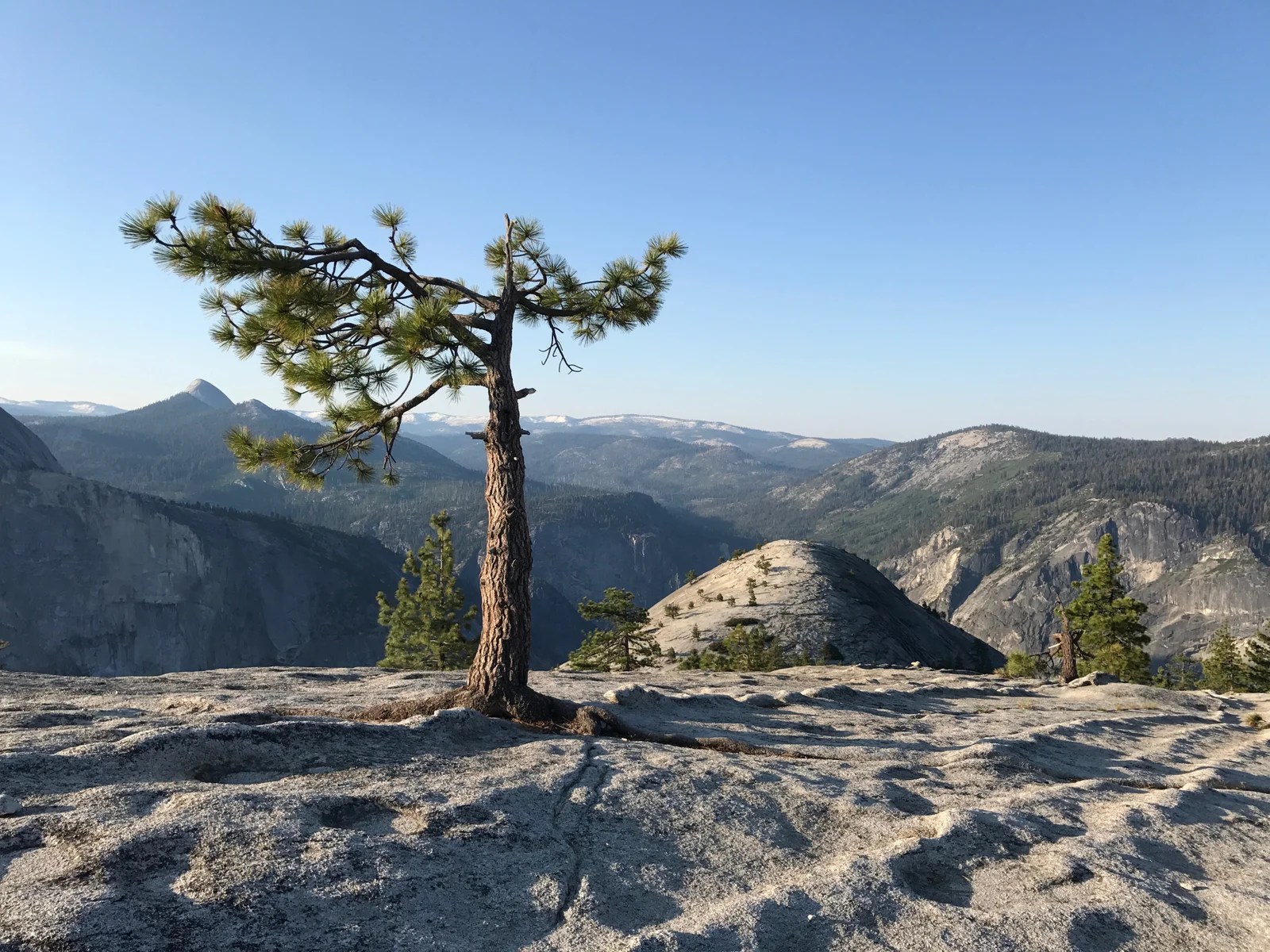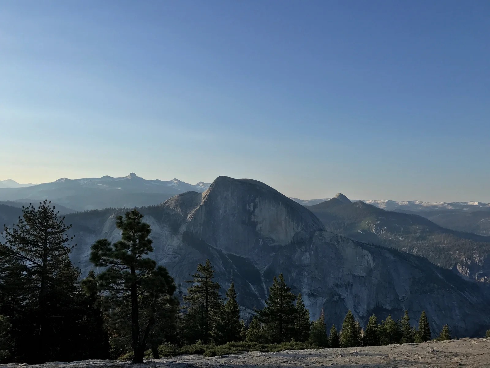 Still, it’s a fairly quick hike (easily completed in 4 hours or less), and as our group got into rhythm, we began to enjoy the plentiful trees, rocky vistas, and tranquil early-morning sights and sounds on our trek. By the time we made it to the rocky area with about a mile or so to the dome, the sun had broken through the darkness, and we could see beautiful Half Dome to our left.