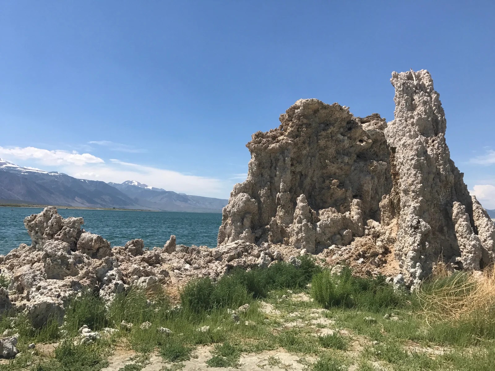 We drove through the 100-degree heat to the grove and walked along a boardwalk to get to the tufa towers. It was a seriously cool sight seeing the beige rocky structures contrasted against the teal-blue salt water of Mono Lake and the bright green foliage of the local plants. I had a great time walking around, snapping pictures, and imagining the towers as ancient temples and statues of a bygone underwater civilization.