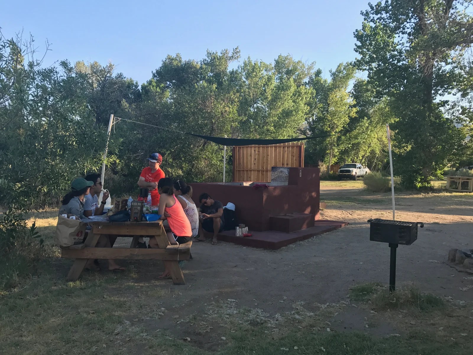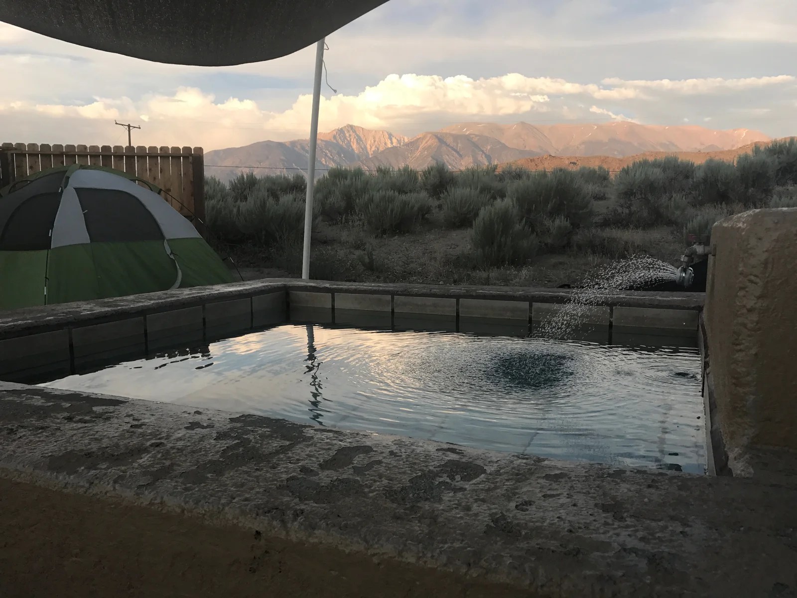 One of the highlights of our trip was our Saturday evening camping experience at Benton Hot Springs, located further east of Mono Lake near the Nevada border. The campground features 11 campsites, each with its own private hot tub fed with water from the local hot springs. Our group went all-out and booked 3 campsites for the evening, which meant we had 3 private hot tubs to use at our leisure!
