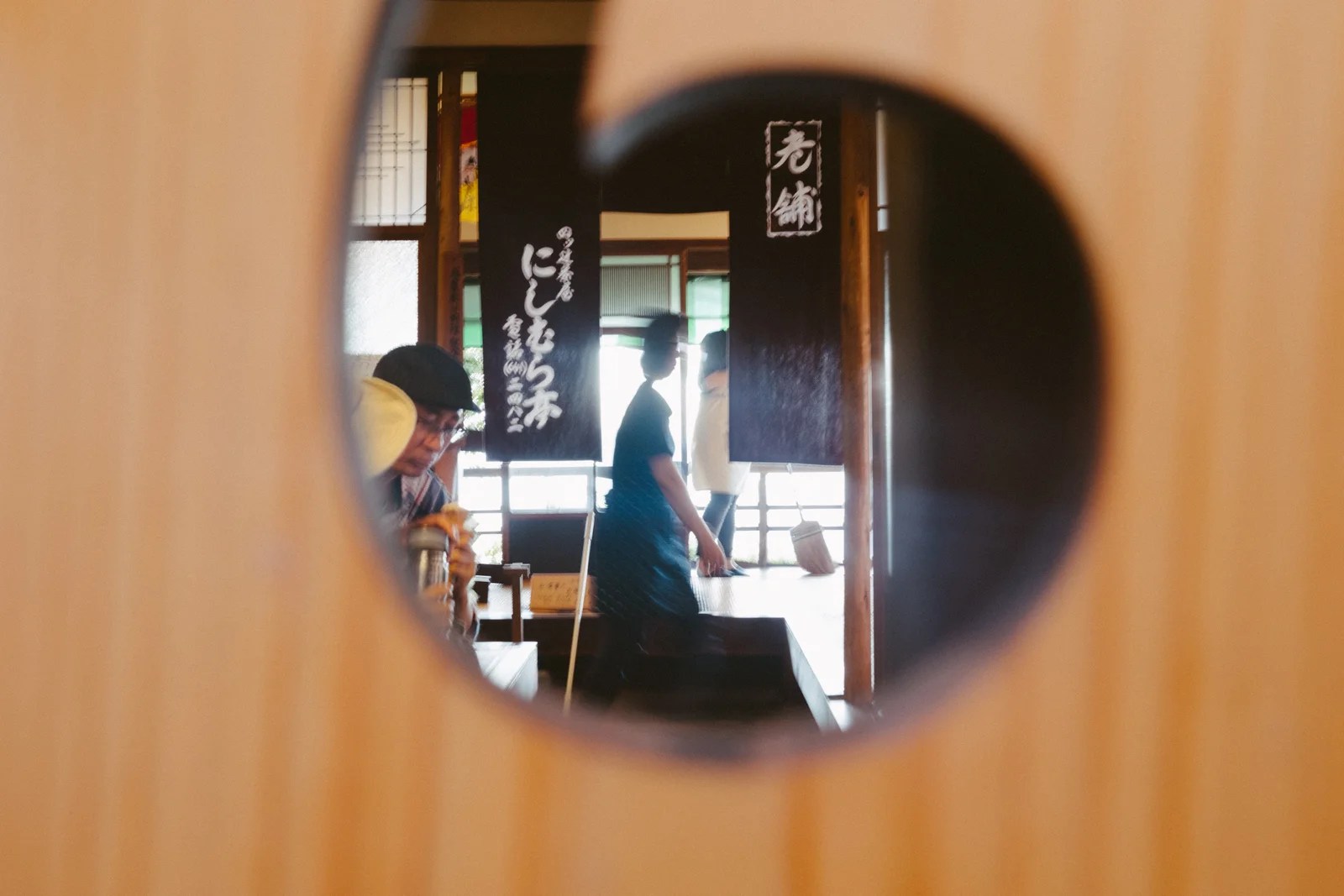 Moving in to clean the tables briefly after patrons leave. Shot at the top of Fushimi-Inaru, looking through one of the window panels of a little rest shop.
